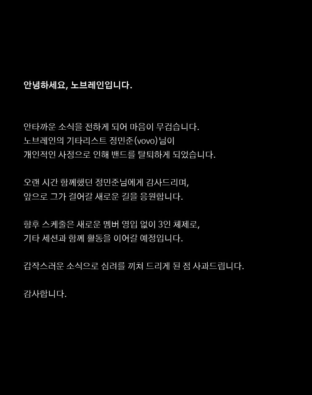 - 정민준 – 기타. 날카로운 기타 리프와 그루브감으로 노브레인의 사운드 축을 담당하는 핵심 멤버입니다.