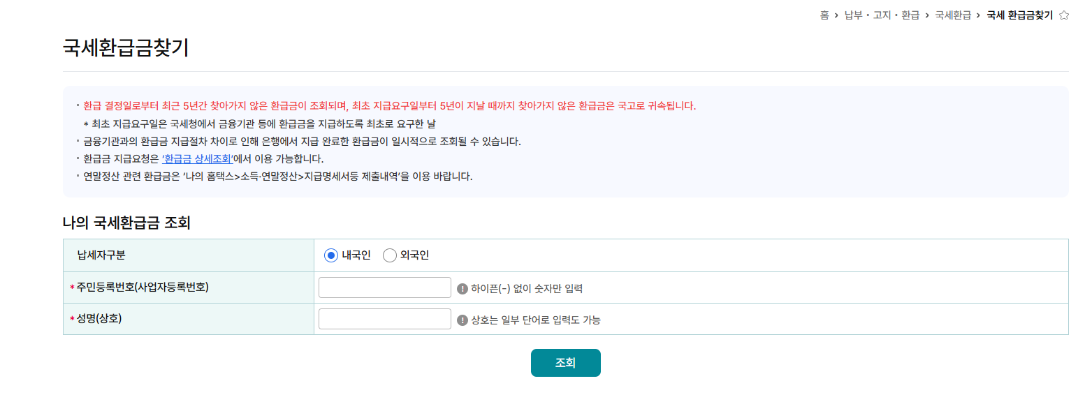 - ‘국세 환급금 찾기’ 항목에서 주민등록번호 입력 후 조회 클릭