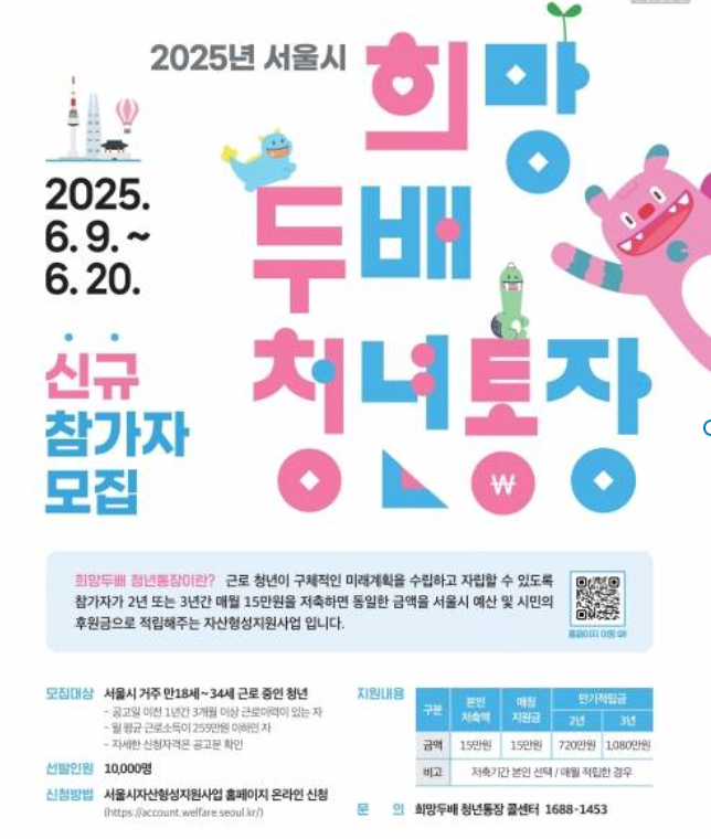 서울에 거주 중인 청년이라면, 이번 6월을 주목해보세요. 서울시가 자산 형성을 돕기 위해 운영하는 ‘희망두배 청년통장’이 2025년 6월 신규 참여자를 모집 중이에요. 정기적인 소득이 있는 청년이 일정 금액을 저축하면, 서울시가 같은 금액을 추가로 적립해주는 제도인데요. 만기 시 최대 1,080만 원까지 목돈 마련이 가능합니다.